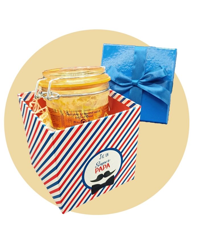 Cube Super Papa avec foie gras de canard entier 190 g. Une idée cadeau gourmande et pleine d’attention pour les papas.