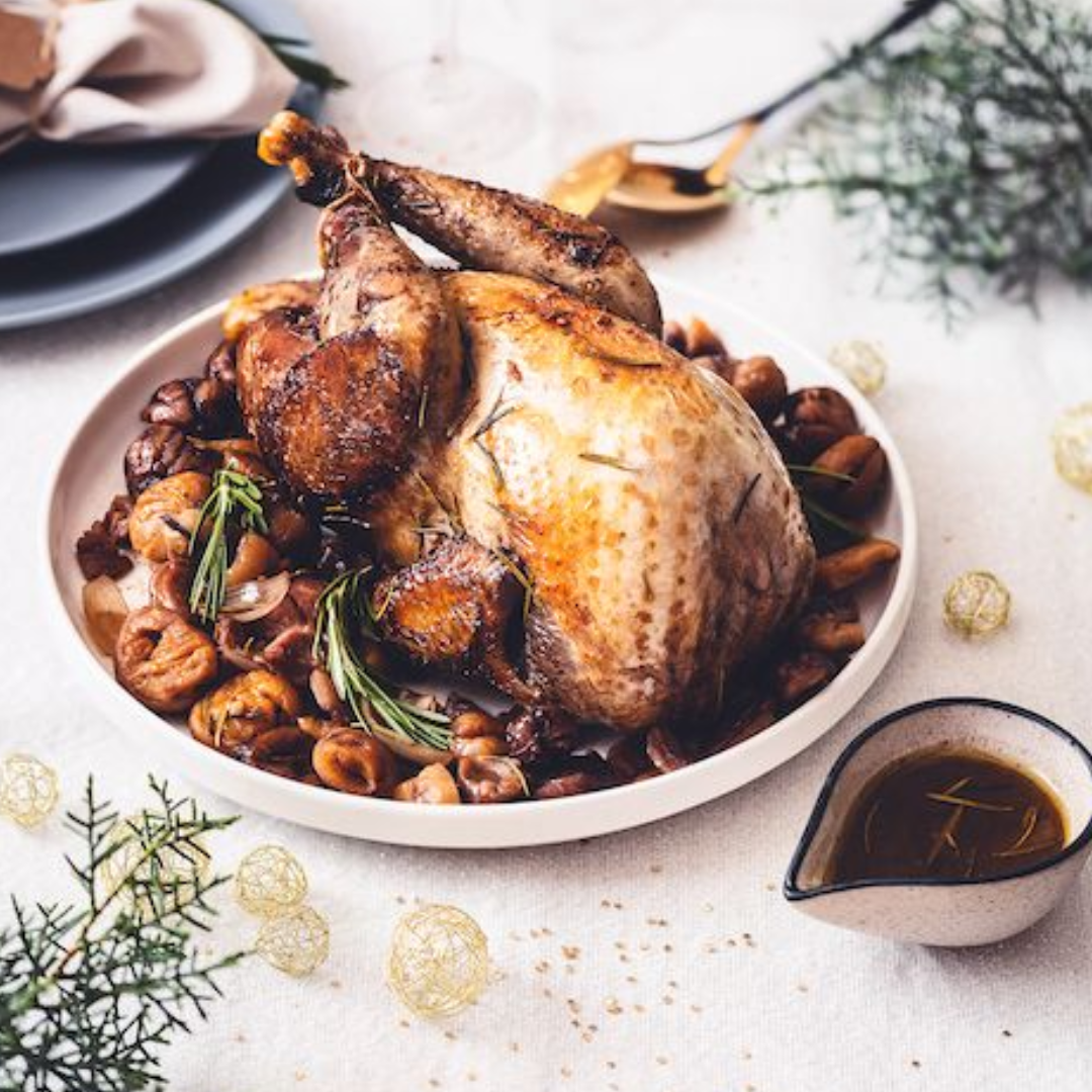 Menu de Noël traditionnel : foie gras poêlé, pintade aux marrons et bûche maison