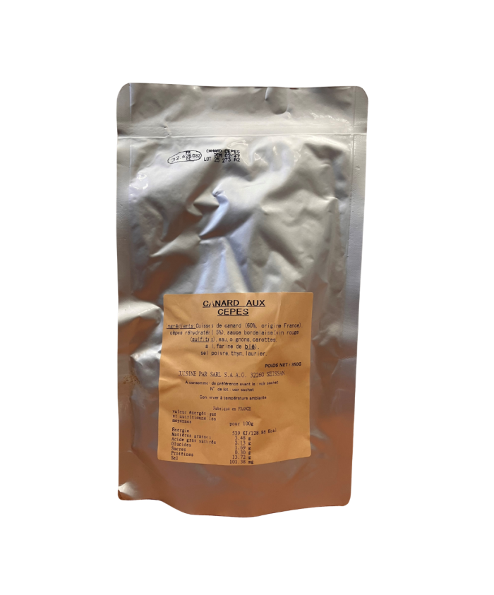 Canard aux cèpes en sachet 350 g : cuisse de canard du Gers mijotée en sauce bordelaise avec cèpes.